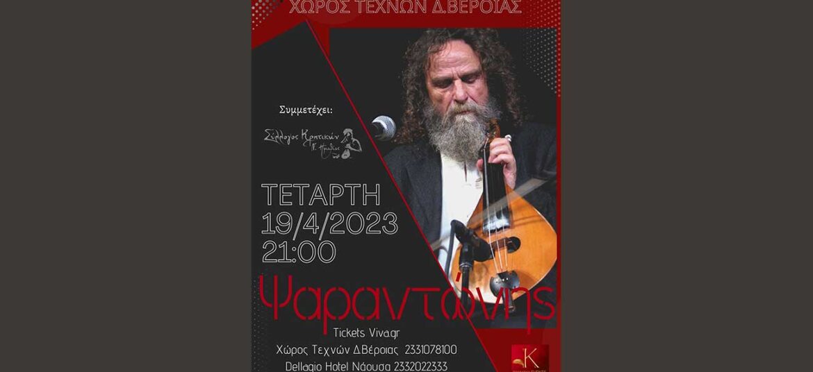 Τετάρτη 19 Απριλίου, 21:00 Η Kostello’s Events διοργανώνει και η ΚΕΠΑ Δήμου Βέροιας φιλοξενεί συναυλία με τον Ψαραντώνη,, έναν ζωντανό θρύλο της μουσικής, ο οποίος έχει εμπλουτίσει με τους ήχους και … Συνεχίστε να διαβάζετε το Ο Ψαραντώνης στον Χώρο Τεχνών Δήμου Βέροιας.