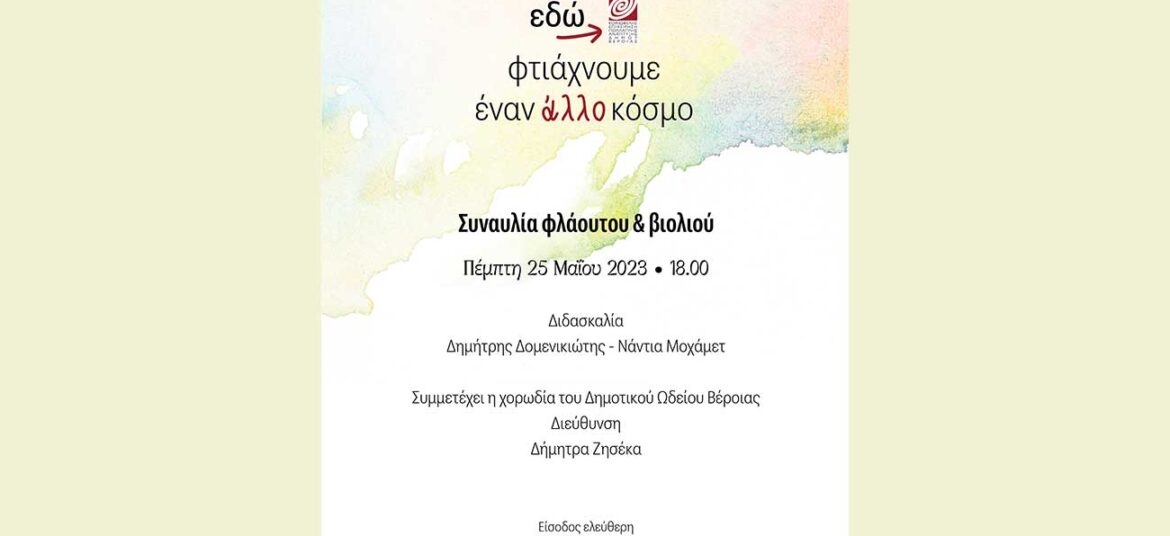 ΔΗΜΟΤΙΚΟ ΩΔΕΙΟ ΤΗΣ ΚΕΠΑ ΔΗΜΟΥ ΒΕΡΟΙΑΣ ΕΚΠΑΙΔΕΥΤΙΚΕΣ ΔΡΑΣΤΗΡΙΟΤΗΤΕΣ 2022- 2023 Την Πέμπτη 25 Μαΐου και ώρα 6:00 οι μαθητές των τάξεων φλάουτου, βιολιού και χορωδίας του Δημοτικού Ωδείου Βέροιας θα παρουσιάσουν στην αίθουσα … Συνεχίστε να διαβάζετε το Συναυλία τμημάτων φλάουτου, βιολιού και χορωδίας Δημοτικού Ωδείου Βέροιας.
