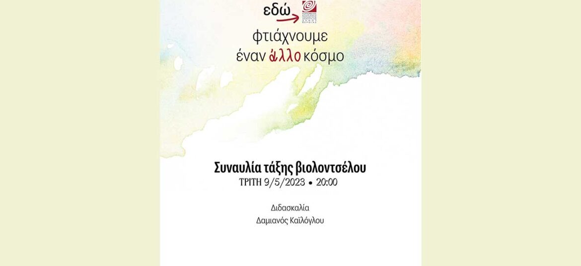 ΔΗΜΟΤΙΚΟ ΩΔΕΙΟ ΤΗΣ ΚΕΠΑ ΔΗΜΟΥ ΒΕΡΟΙΑΣ ΕΚΠΑΙΔΕΥΤΙΚΕΣ ΔΡΑΣΤΗΡΙΟΤΗΤΕΣ 2022- 2023 Συναυλία τμήματος Βιολοντσέλου Την Τρίτη 9 Μαΐου, ώρα 8:00 στην αίθουσα της Στέγης Γραμμάτων και Τεχνών οι μαθητές του τμήματος βιολοντσέλου, του Δημοτικού Ωδείου Βέροιας θα παρουσιάσουν έργα των J. S. Bach, C. Saint Saens, J. B. Breval, A. Vivaldi και άλλων συνθετών. Συμμετέχουν οι μαθητές: Νίκη Πυροβολάκη, Έλσα Ιωαννίδου, Κασσιανή Χιονίδου, Δημήτρης Αφεντούλης, Μαρία Παυλίδου, Μαριλένα Θεοδωρίδου, Κωνσταντίνα Μανιώτη, Σταύρος Γαλάνης, Βασίλης Αφεντούλης. Συνοδεία πιάνου: Πόπη Φιρτινίδου, Βαλεντίνη Φωκά και Άννα Μέλιου. Διδασκαλία: Δαμιανός Καϊλόγλου. Είσοδος ελεύθερη.