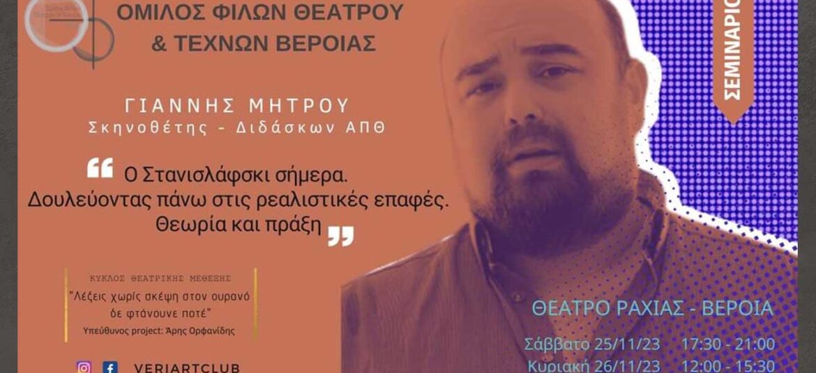 Ο Όμιλος Φίλων Θεάτρου και Τεχνών Βέροιας μεριμνά πάντα για τα μέλη του και το φιλότεχνο κοινό, διοργανώνοντας ενδιαφέροντα σεμινάρια στο πλαίσιο του κύκλου θεατρικής μέθεξης «Λέξεις χωρίς σκέψη στον … Συνεχίστε να διαβάζετε το Ο Στανισλάφσκι σήμερα. Δουλεύοντας πάνω στις ρεαλιστικές επαφές. Θεωρία και πράξη.