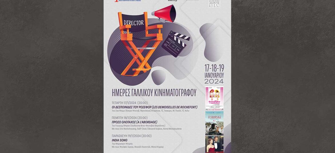 H Ένωση Καθηγητών Γαλλικής Δημόσιας Εκπαίδευσης Ημαθίας και η ΚΕΠΑ του Δήμου Βέροιας, σε συνεργασία με τη Γαλλική Πρεσβεία στην Ελλάδα και το Γαλλικό Ινστιτούτο Θεσσαλονίκης, διοργανώνουν Ημέρες Γαλλικού Κινηματογράφου, … Συνεχίστε να διαβάζετε το Ημέρες Γαλλικού Κινηματογράφου 17 – 19 Ιανουαρίου 2024.