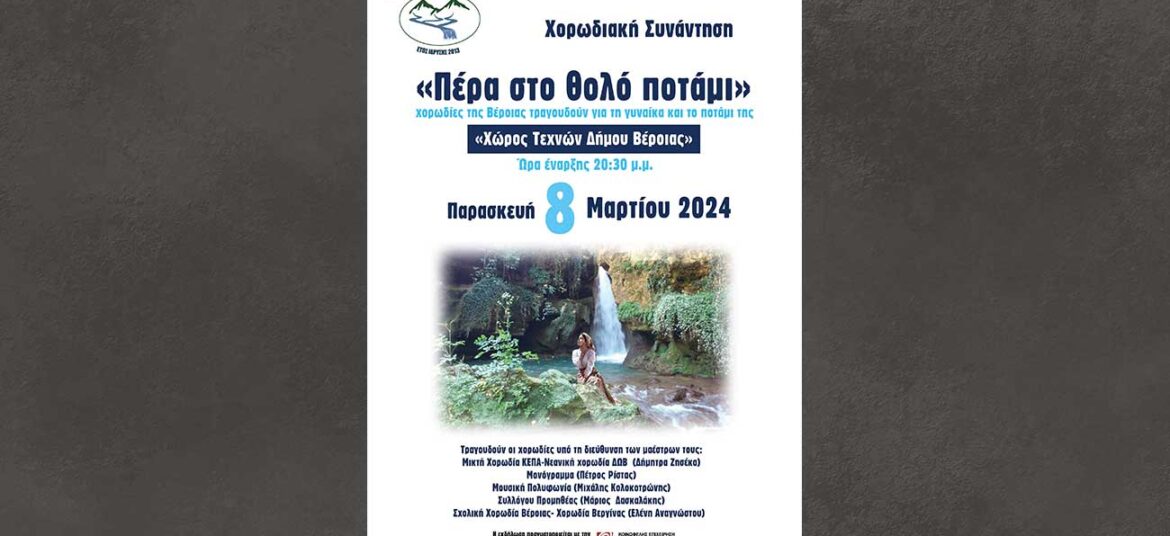 Χορωδιακή συνάντηση έξι χορωδιών του Δήμου Βέροιας. Τραγουδούν για την γυναίκα και το ποτάμι μας! Παρασκευή 8 Μαρτίου στις 8.30μ.μ. στον Χώρο Τεχνών Βέροιας. Εισιτήριο 5 ευρώ, για την στήριξη … Συνεχίστε να διαβάζετε το Πέρα στο θολό ποτάμι – Σύλλογος Φίλοι του ποταμού Τριποτάμου.