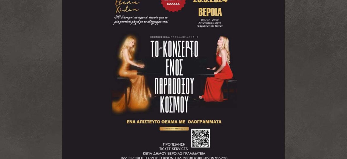 Η ΚΕΠΑ Δήμου Βέροιας φιλοξενεί την διάσημη “Ιπτάμενη Πιανίστα” Έλενα Ξυδιά στις 20 Μάρτη, ώρα 8.30μ.μ. για μια και μοναδική παράσταση στην Αντωνιάδειο Στέγη Γραμμάτων & Τεχνών. Η παράσταση υπό … Συνεχίστε να διαβάζετε το Το Κονσέρτο Ενός Παραδόξου Κόσμου.