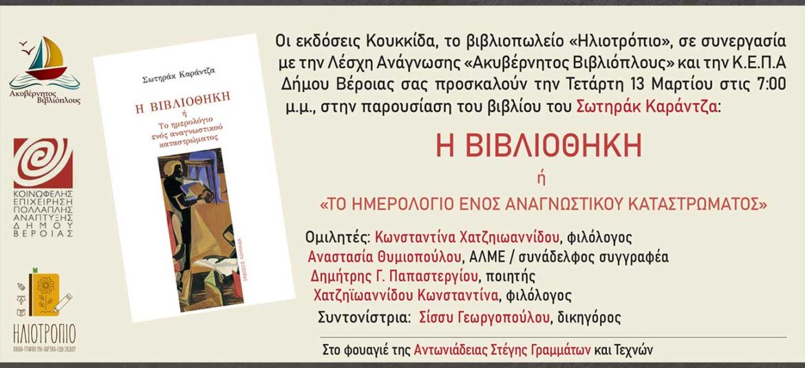 Λογοτεχνικά Απογεύματα στο Φουαγιέ της Στέγης ! Οι εκδόσεις Κουκκίδα, το βιβλιοπωλείο «Ηλιοτρόπιο», σε συνεργασία με την Λέσχη Ανάγνωσης «Ακυβέρνητος ΒΙβλιόπλους» και την Κ.Ε.Π.Α Δήμου Βέροιας παρουσιάζουν το βιβλίο του … Συνεχίστε να διαβάζετε το Η βιβλιοθήκη ή Το Ημερολόγιο Ενος Αναγνωστικού Καταστρώματος, του Σωτηράκ Καράντζα.