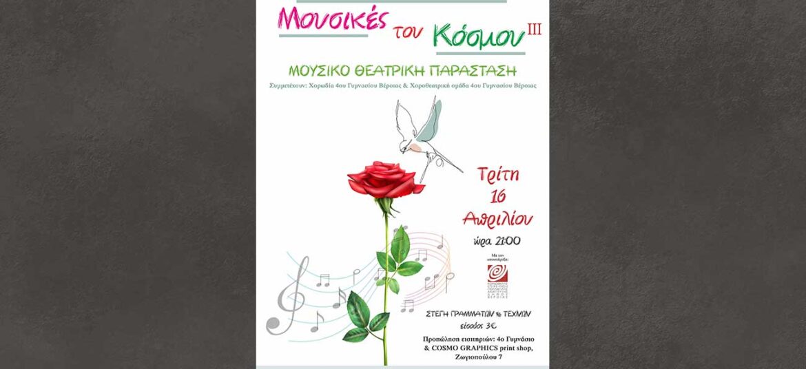 4ο Γυμνάσιο Βέροιας Μουσικοθεατρική παράσταση “Μουσικές του κόσμου” Ο Σύλλογος Γονέων & Κηδεμόνων του 4ου Γυμνασίου Βέροιας με την υποστήριξη της Κοινωφελούς Επιχείρησης Πολλαπλής Ανάπτυξης του Δήμου Βέροιας, την Τρίτη … Συνεχίστε να διαβάζετε το Μουσικοθεατρική παράσταση – Μουσικές του κόσμου.