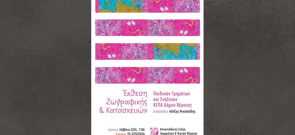 Έκθεση ζωγραφικής με έργα μαθητών από τμήματα εικαστικών, ζωγραφικής παιδιών και ενηλίκων καθώς και παιδικά τμήματα κατασκευών της ΚΕΠΑ Δήμου Βέροιας, θα πραγματοποιηθεί στο Φουαγιέ της Αντωνιάδειας Στέγης Γραμμάτων και … Συνεχίστε να διαβάζετε το Έκθεση με έργα μαθητών από τα τμήματα ζωγραφικής, εικαστικών και κατασκευών της ΚΕΠΑ.
