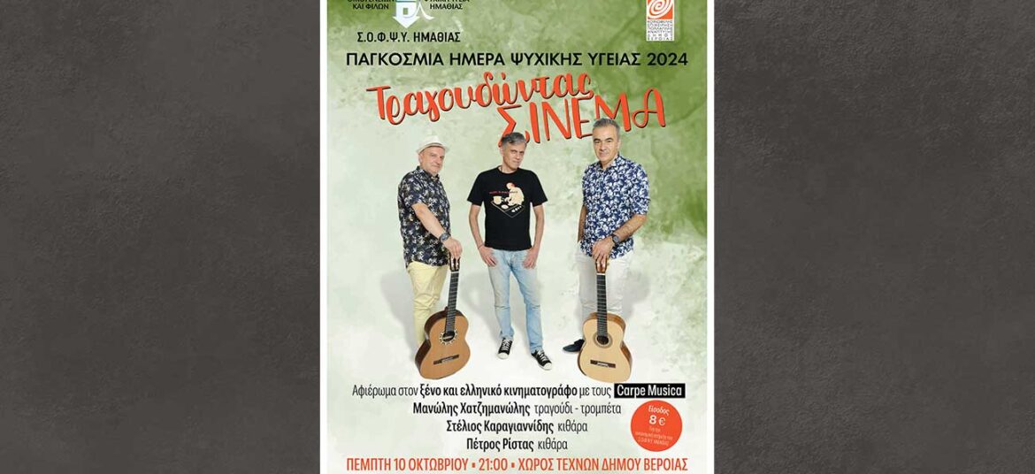 Διήμερο εκδηλώσεων (9-10 Οκτωβρίου) με εργαστήρια, ομιλίες και μουσική βραδιά, διοργανώνει ο ΣΟΦΨΥ Ημαθίας σε συνεργασία με τον Δήμο Βέροιας και την ΚΕΠΑ Δ. Βέροιας, για την Παγκόσμια Ημέρα Ψυχικής … Συνεχίστε να διαβάζετε το «Τραγουδώντας Σινεμά» στο Χώρο Τεχνών.