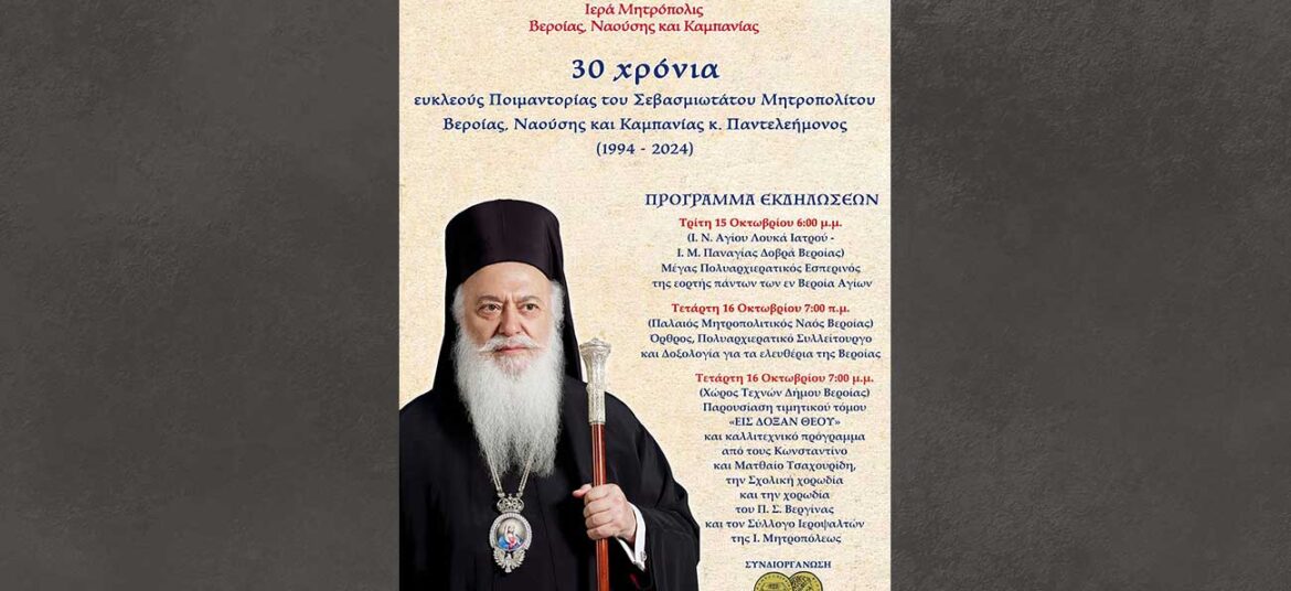 Στο πλαίσιο του εορτασμού για την 112η επέτειο των Ελευθερίων της Βέροιας, την Τετάρτη 16 Οκτωβρίου 2024, θα πραγματοποιηθεί στον Χώρο Τεχνών, στις 7:00 μ.μ., τιμητική εκδήλωση για την επέτειο … Συνεχίστε να διαβάζετε το Τιμητική εκδήλωση στο Χώρο Τεχνών, για τα 30 χρόνια από την ενθρόνιση του Μητροπολίτη Παντελεήμονα.