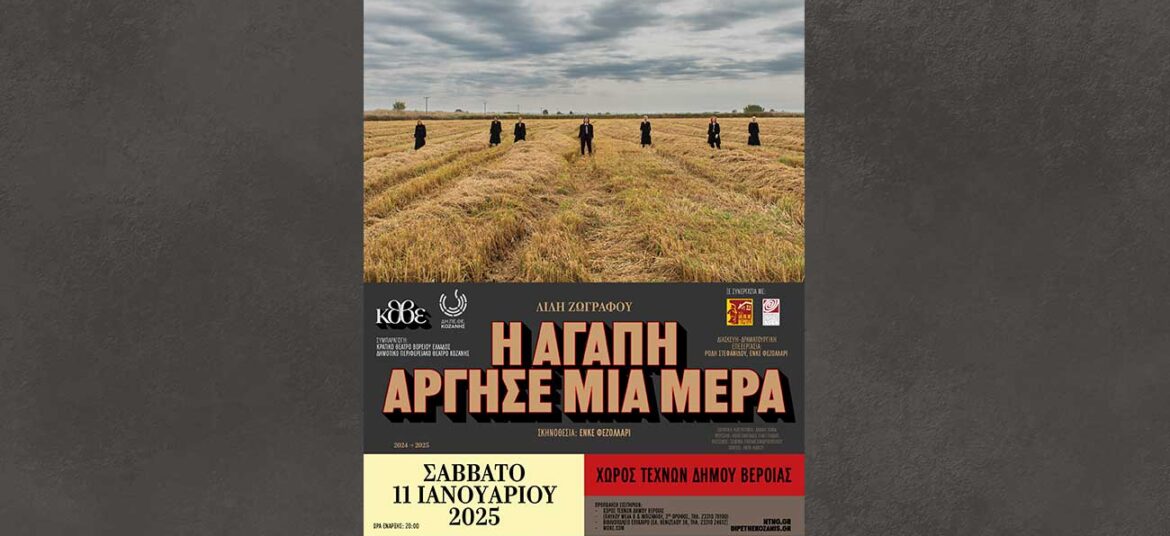 ΣΥΜΠΑΡΑΓΩΓΗ: ΚΘΒΕ ΚΑΙ ΔΗΠΕΘΕ ΚΟΖΑΝΗΣ Μετά τη μεγάλη επιτυχία, σε Θεσσαλονίκη, Κοζάνη αλλά και σε άλλες περιοχές της Βόρειας Ελλάδας, η παράσταση του Κρατικού Θεάτρου Βορείου Ελλάδος και του ΔΗΠΕΘΕ … Συνεχίστε να διαβάζετε το Η αγάπη άργησε μια μέρα» της Λιλής Ζωγράφου, στο Χώρο Τεχνών Βέροιας.
