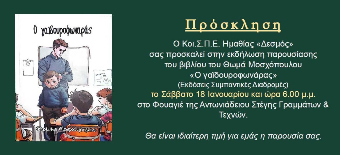 Ο Κοι.Σ.Π.Ε. Ημαθίας “Δεσμός” παρουσιάζει το βιβλίο του Θωμά Μοσχόπουλου «Ο γαϊδουροφωναράς», το Σάββατο 18 Ιανουαρίου στις 6.00 μ.μ. στο Φουαγιέ της Αντωνιάδειας Στέγης Γραμμάτων & Τεχνών με την υποστήριξη … Συνεχίστε να διαβάζετε το Λογοτεχνικά απογεύματα στο φουαγιέ της Στέγης, Ο γαϊδουροφωνάρας του Θωμά Μοσχόπουλου από τον Κοι.Σ.Π.Ε. Ημαθίας Δεσμός.