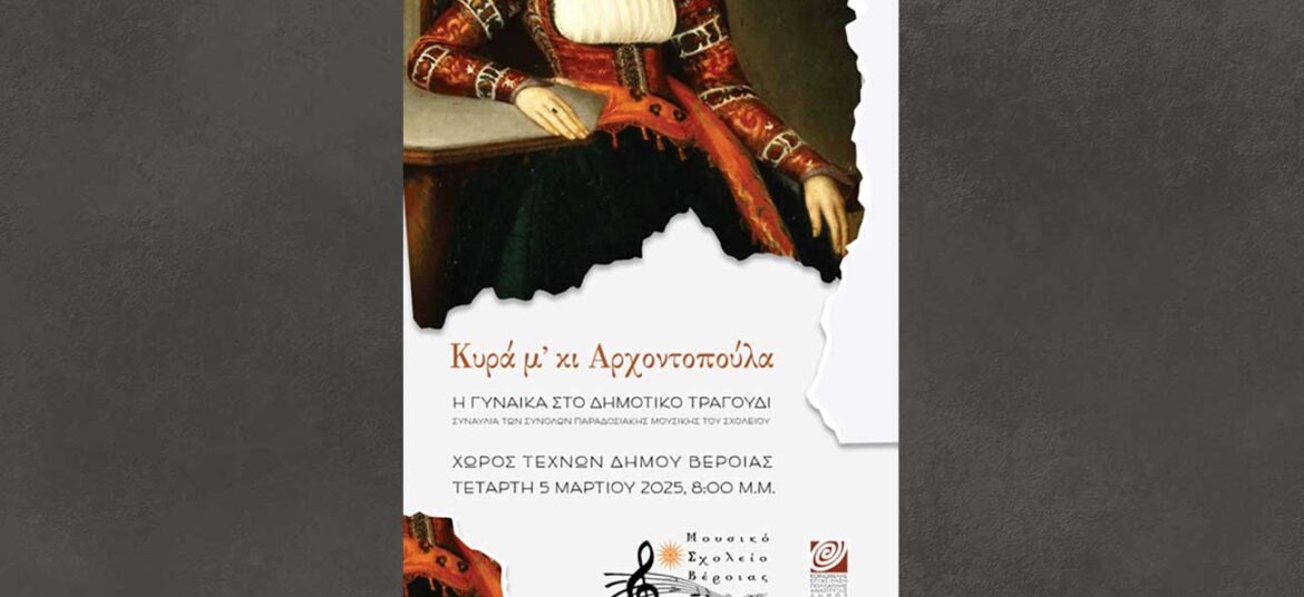 Συναυλία των Συνόλων Παραδοσιακής Μουσικής, με θέμα τη Γυναίκα στο Δημοτικό Τραγούδι και τίτλο: “Κυρά μ΄ κι Αρχοντοπούλα“, παρουσιάζει το Μουσικό Σχολείο Βέροιας, την Τετάρτη 5 Μαρτίου 2025, στις 8:00 … Συνεχίστε να διαβάζετε το Συναυλία παραδοσιακής μουσικής από το Μουσικό Σχολείο, στο Χώρο Τεχνών.