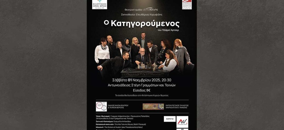 -Τα έσοδα θα διατεθούν στην Φιλόπτωχο Βέροιας Τον Κατηγορούμενο του Τζέφρεϊ Άρτσερ, παρουσιάζει η θεατρική ομάδα almaΤέχνης, σε σκηνοθεσία Ελευθέριου Κορυφίδη, το Σάββατο 1 Νοεμβρίου 2025 στη σκηνή «Οδυσσέας Γωνιάδης» … Συνεχίστε να διαβάζετε το Ο Κατηγορούμενος του Τζέφρεϊ Άρτσερ από την ομάδα almaΤέχνης στη Στέγη.